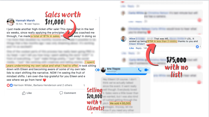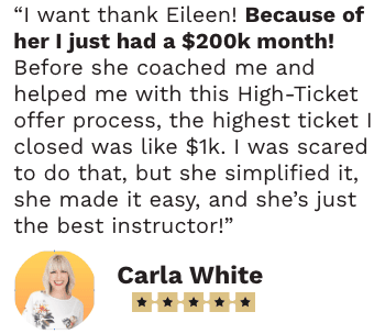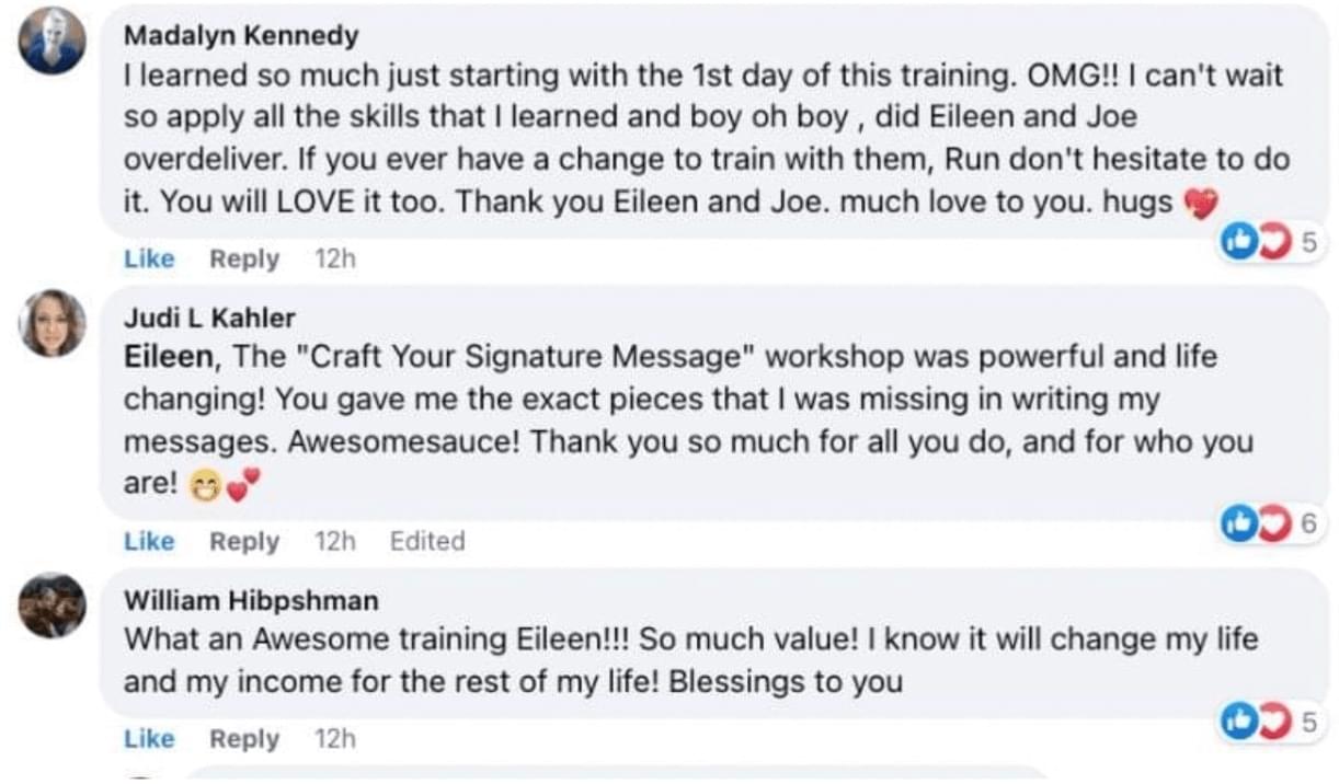 • Grow inside a small, intimate community where Eileen is personally involved and you never have to “figure it out” alone. You’ll be surrounded by coaches, entrepreneurs, and business owners who are on the same journey, and because the group is intentionally kept small, you get real connection, real support, and real personalized attention.